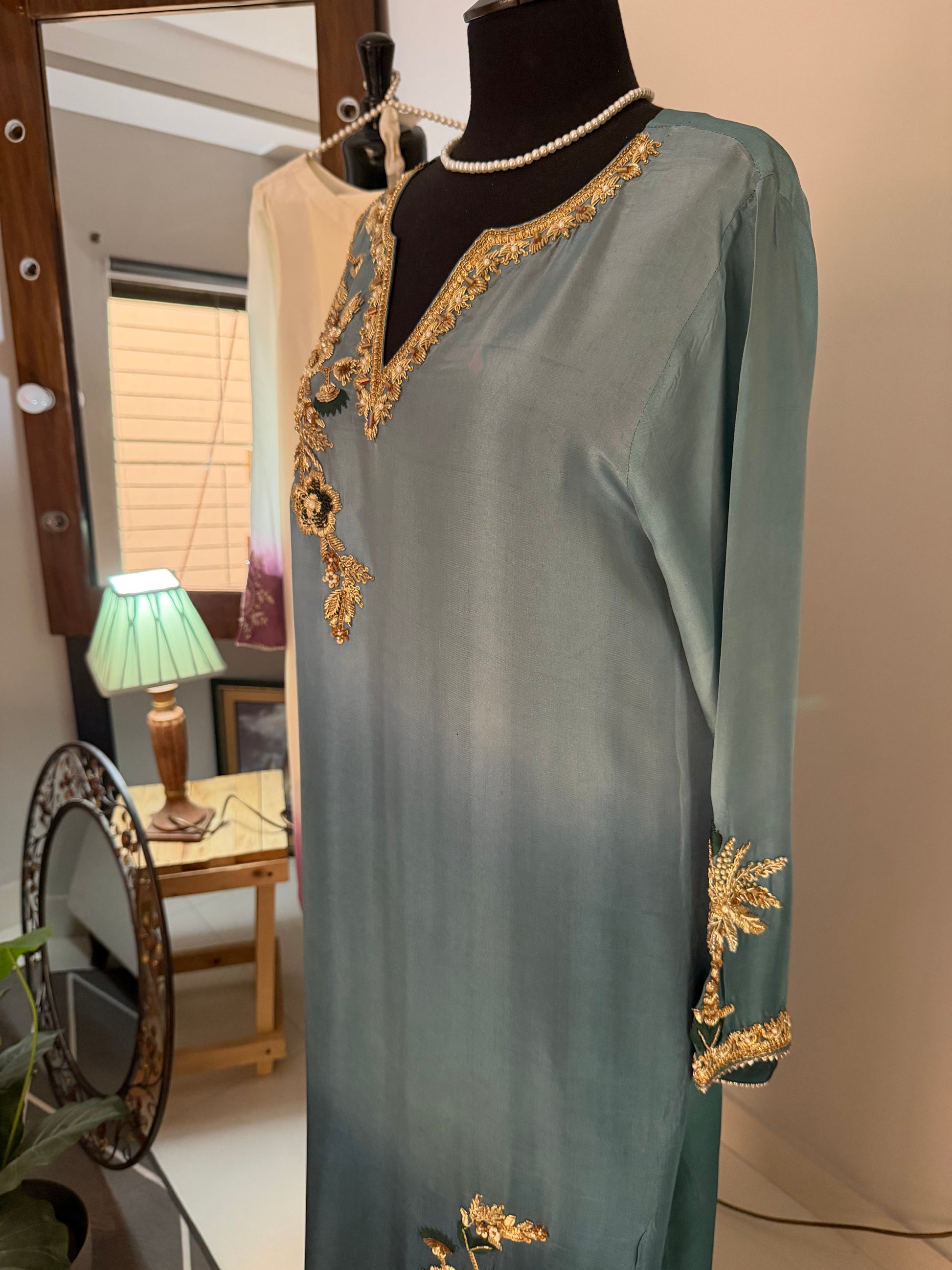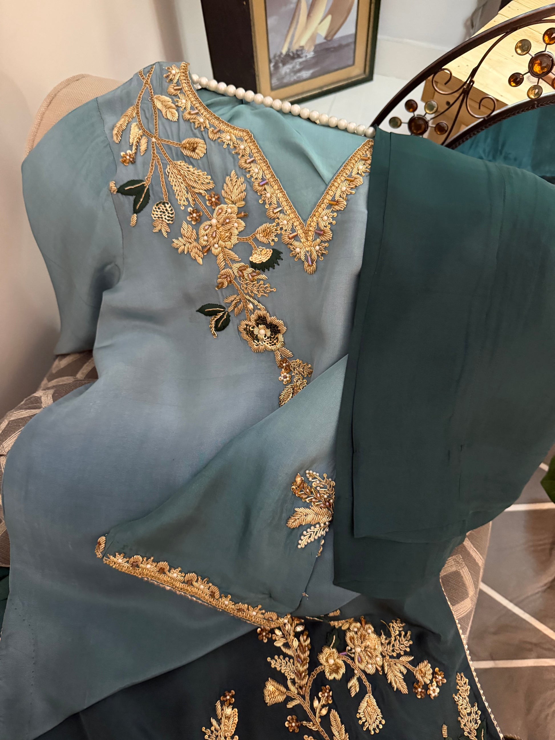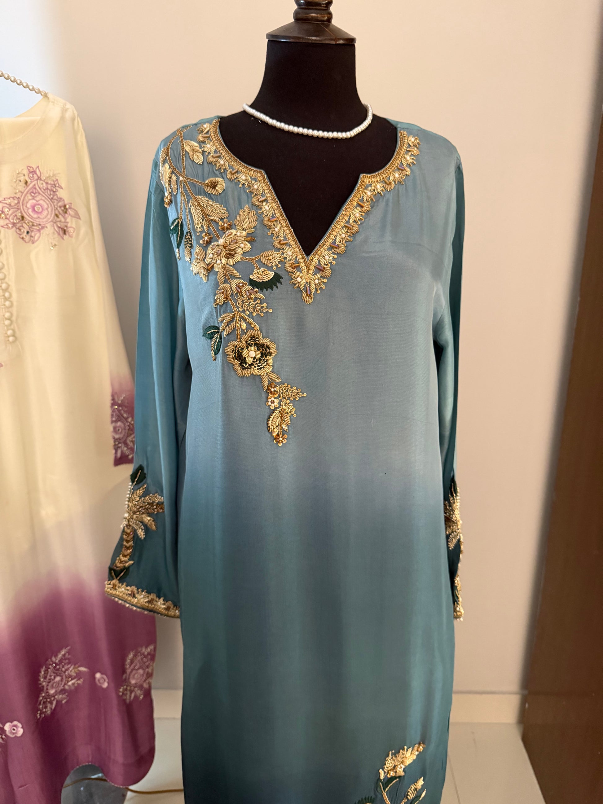 1- Stitched shirt hand embroidered with pure resham paired with highest quality ada work