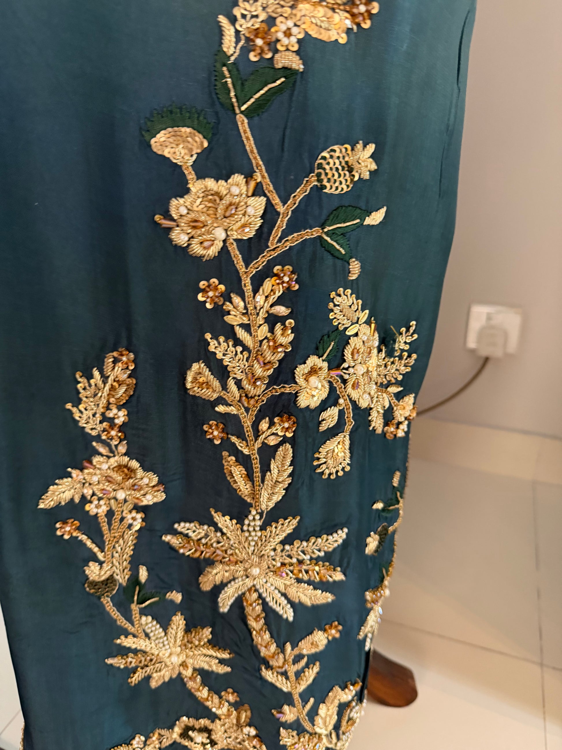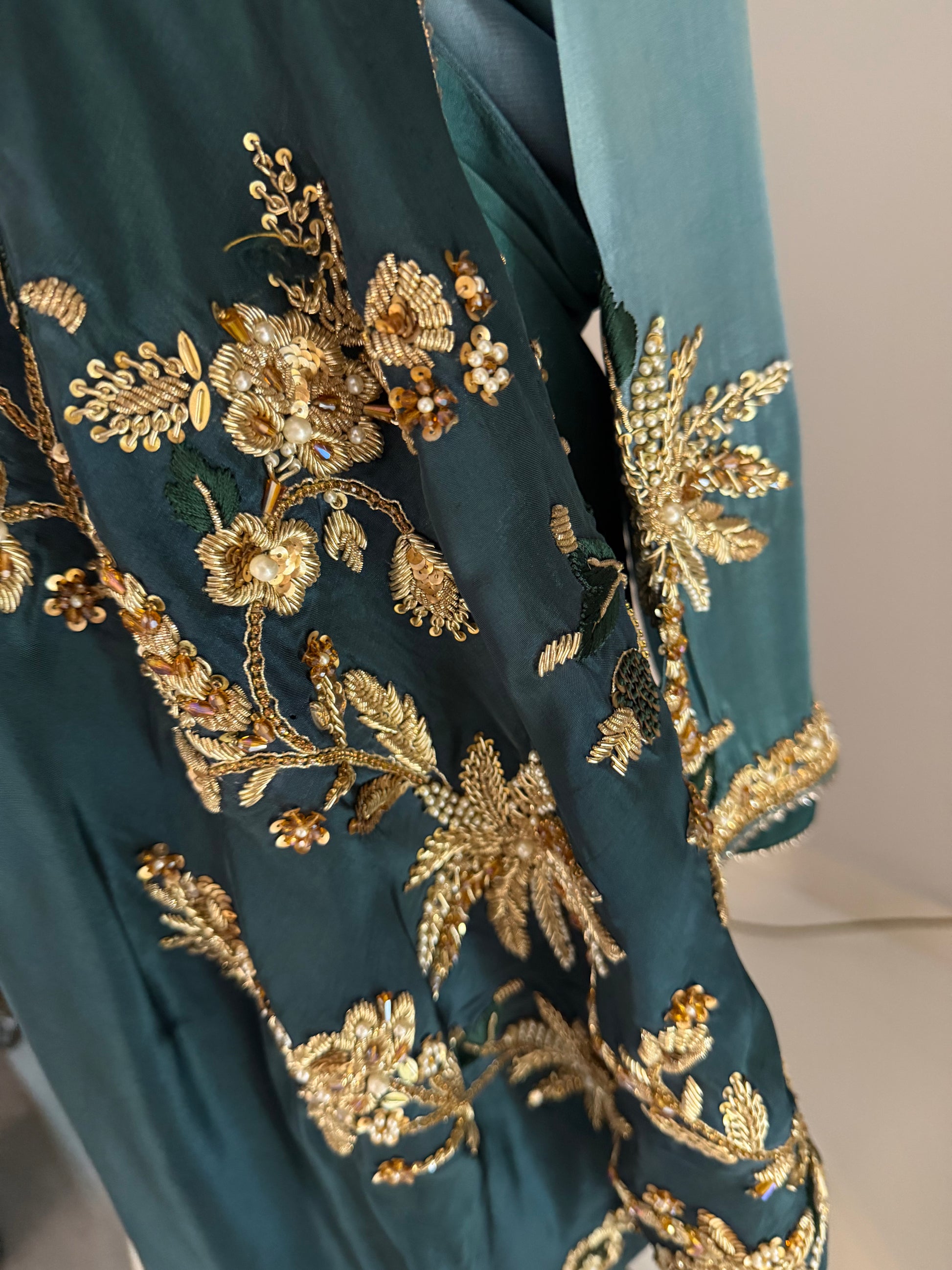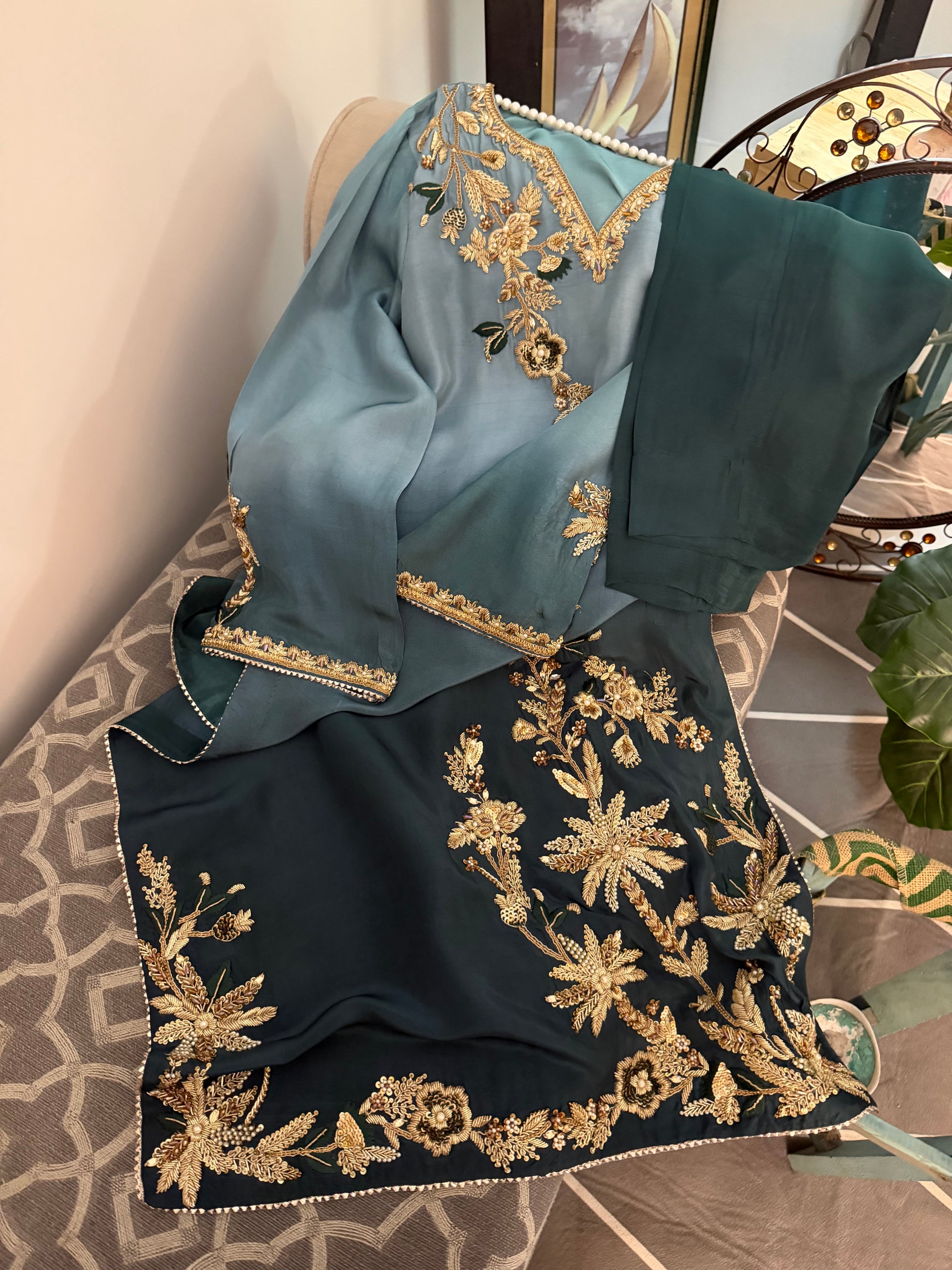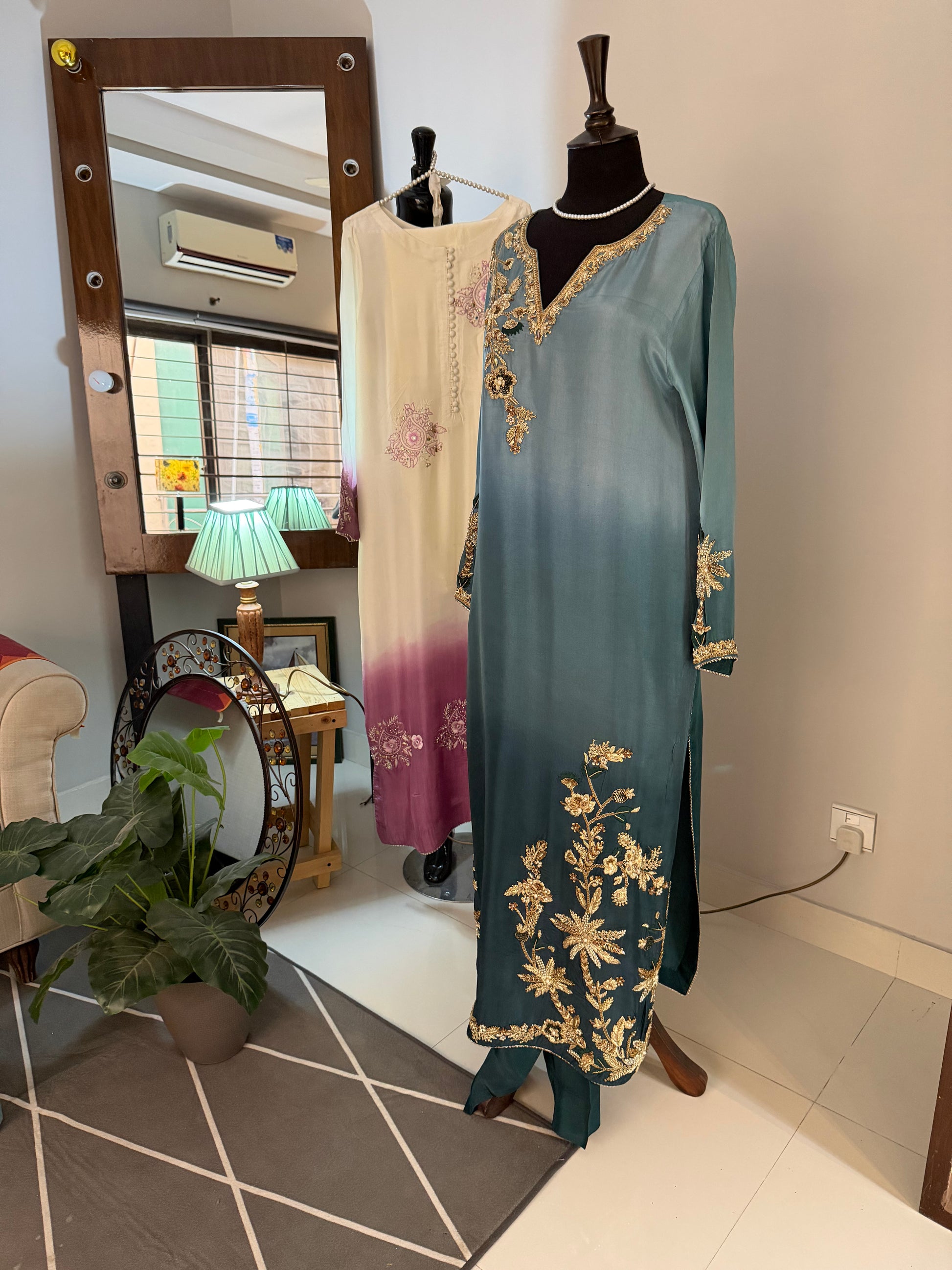 1- Stitched shirt hand embroidered with pure resham paired with highest quality ada work