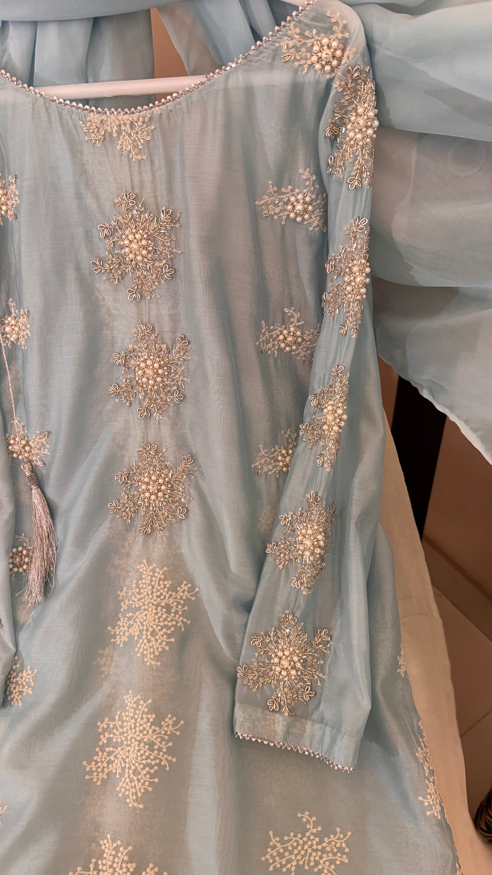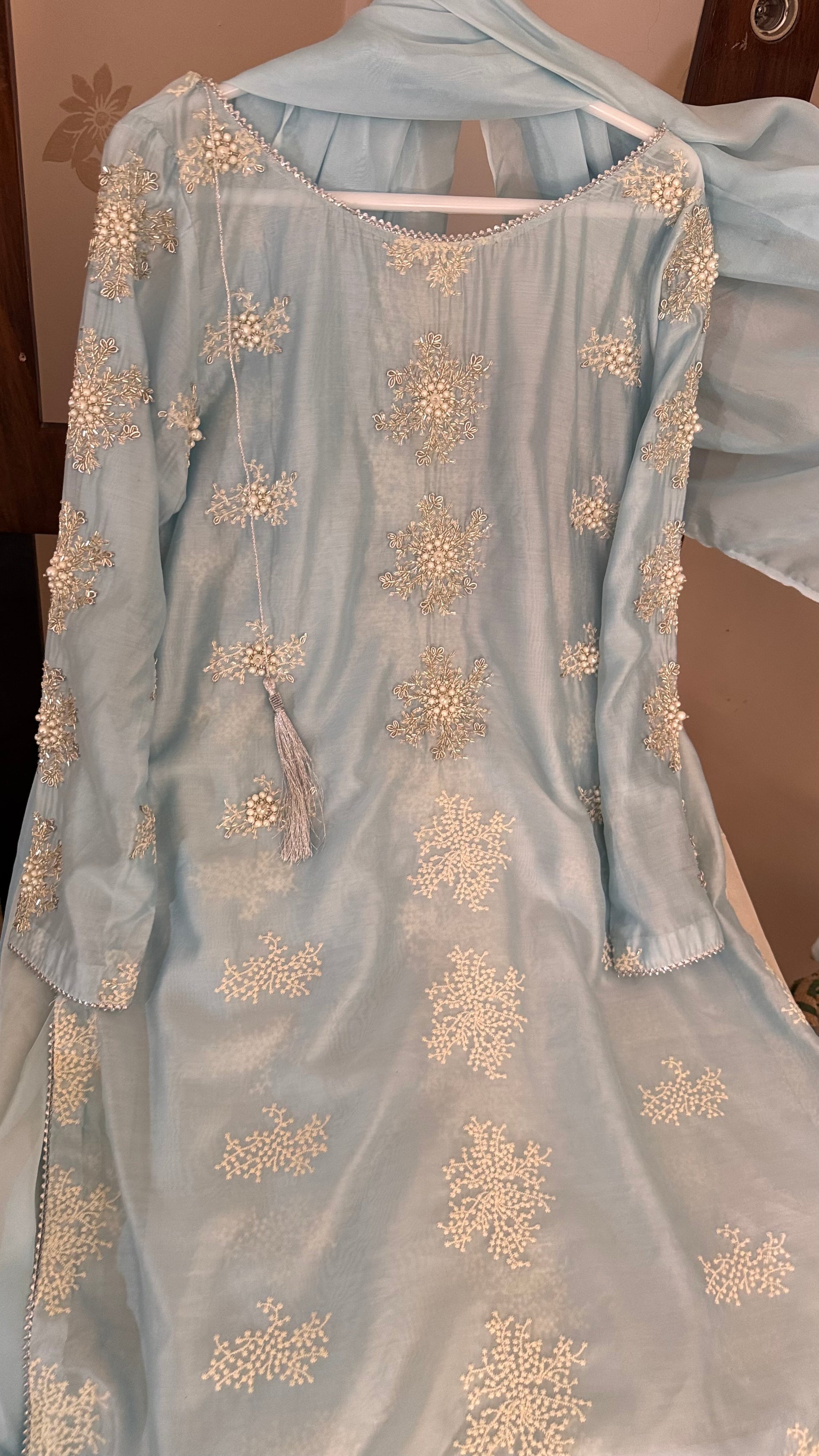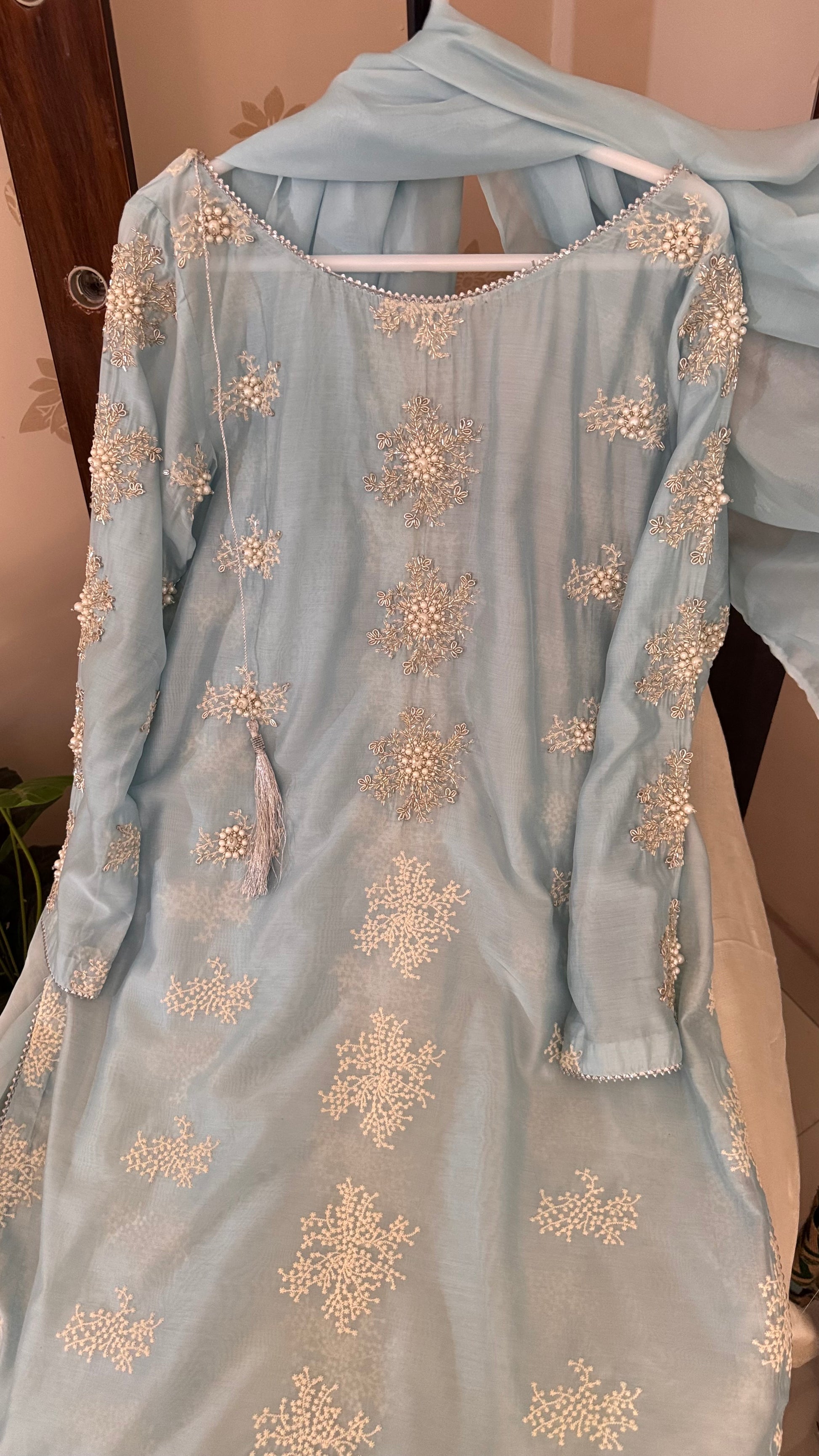 Hand Embellished Kurta with high quality pearl and sequence work with silk dupatta.