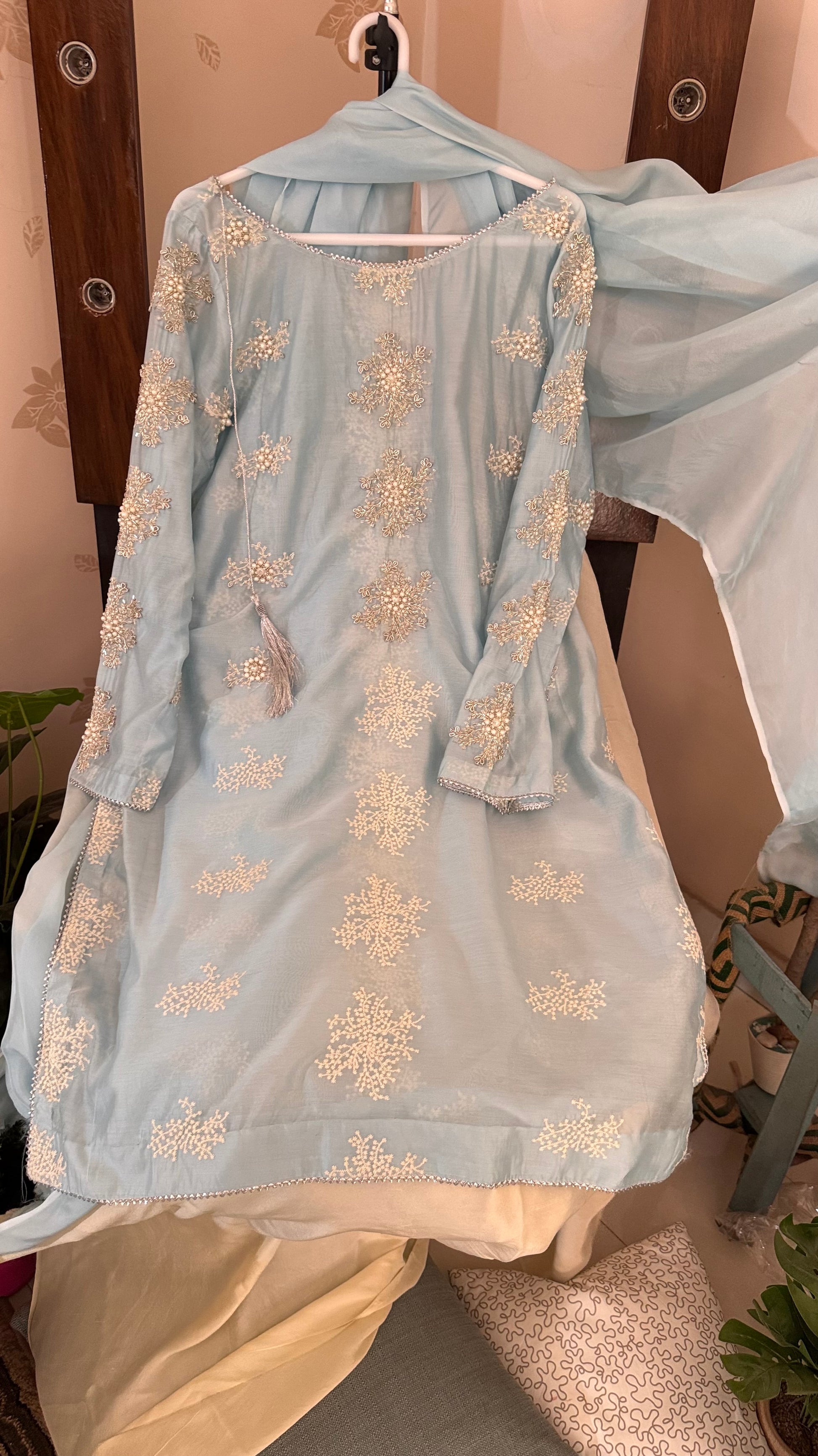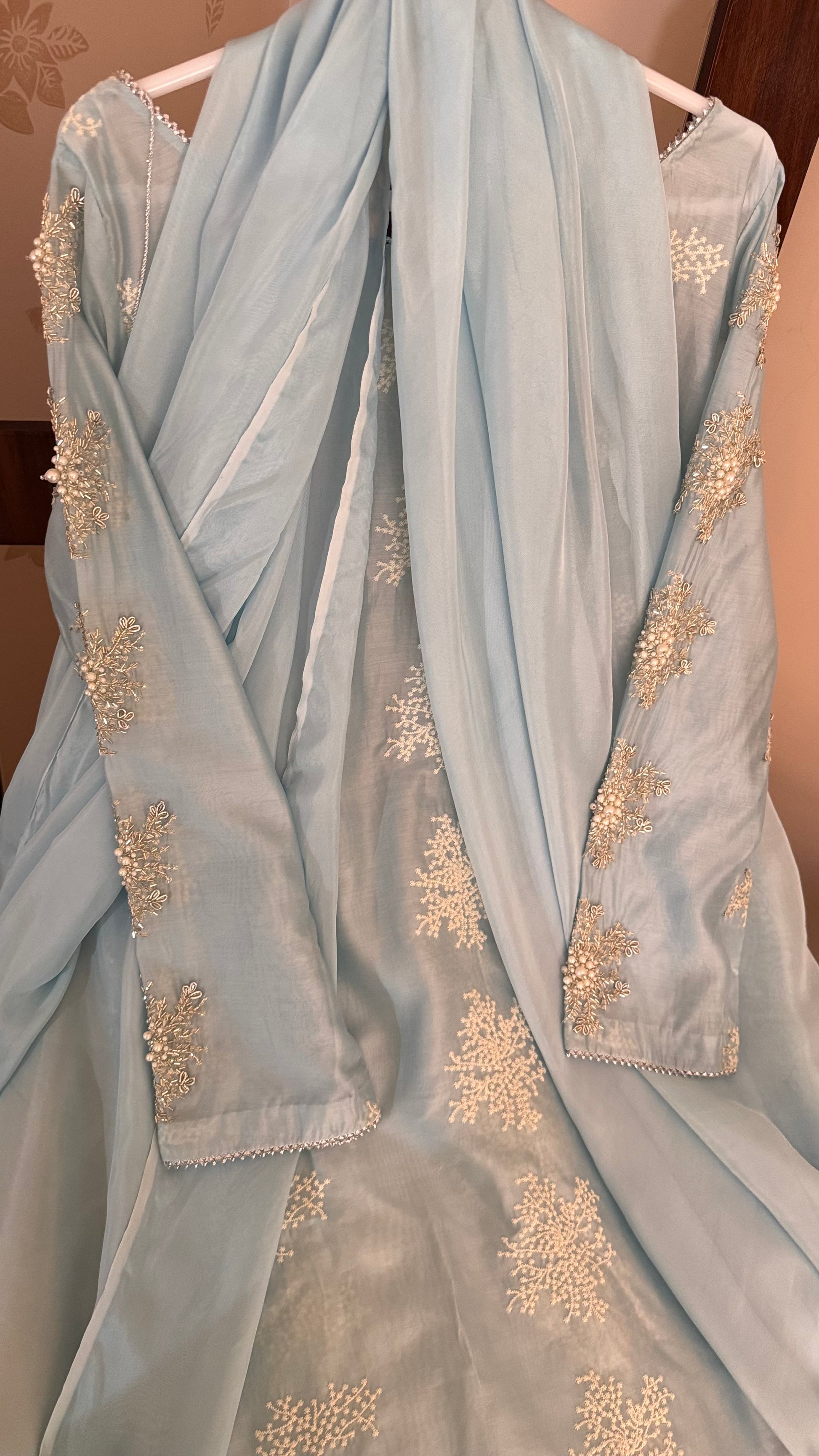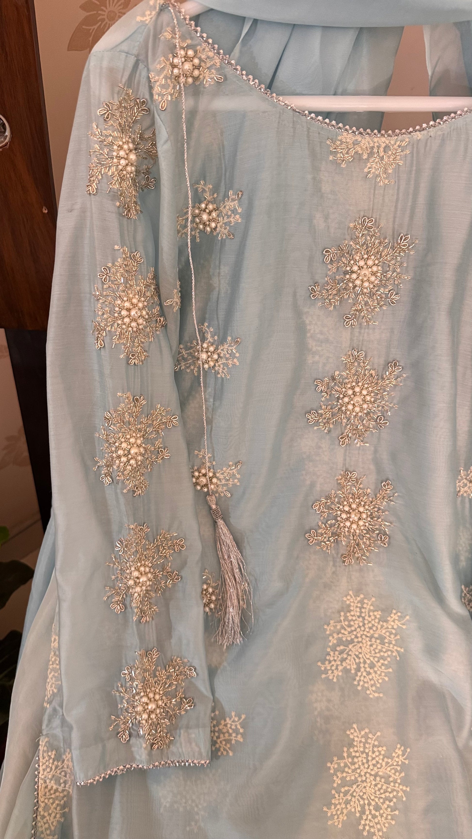Hand Embellished Kurta with high quality pearl and sequence work with silk dupatta.