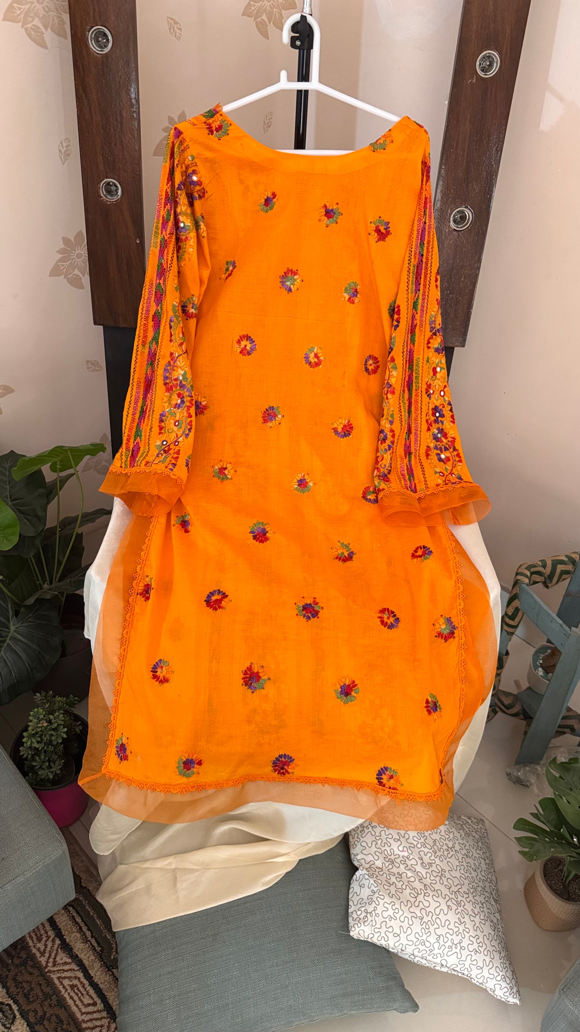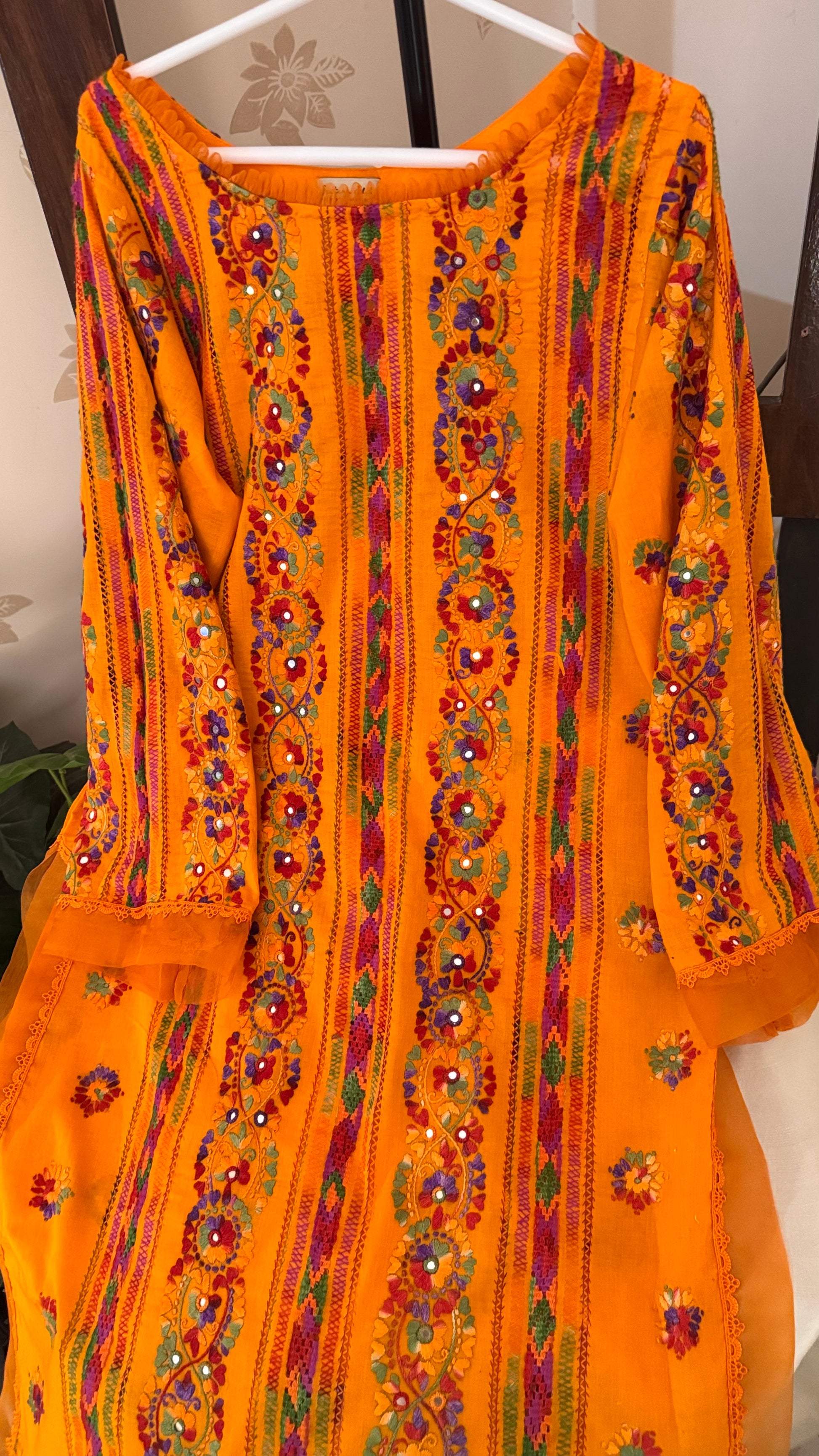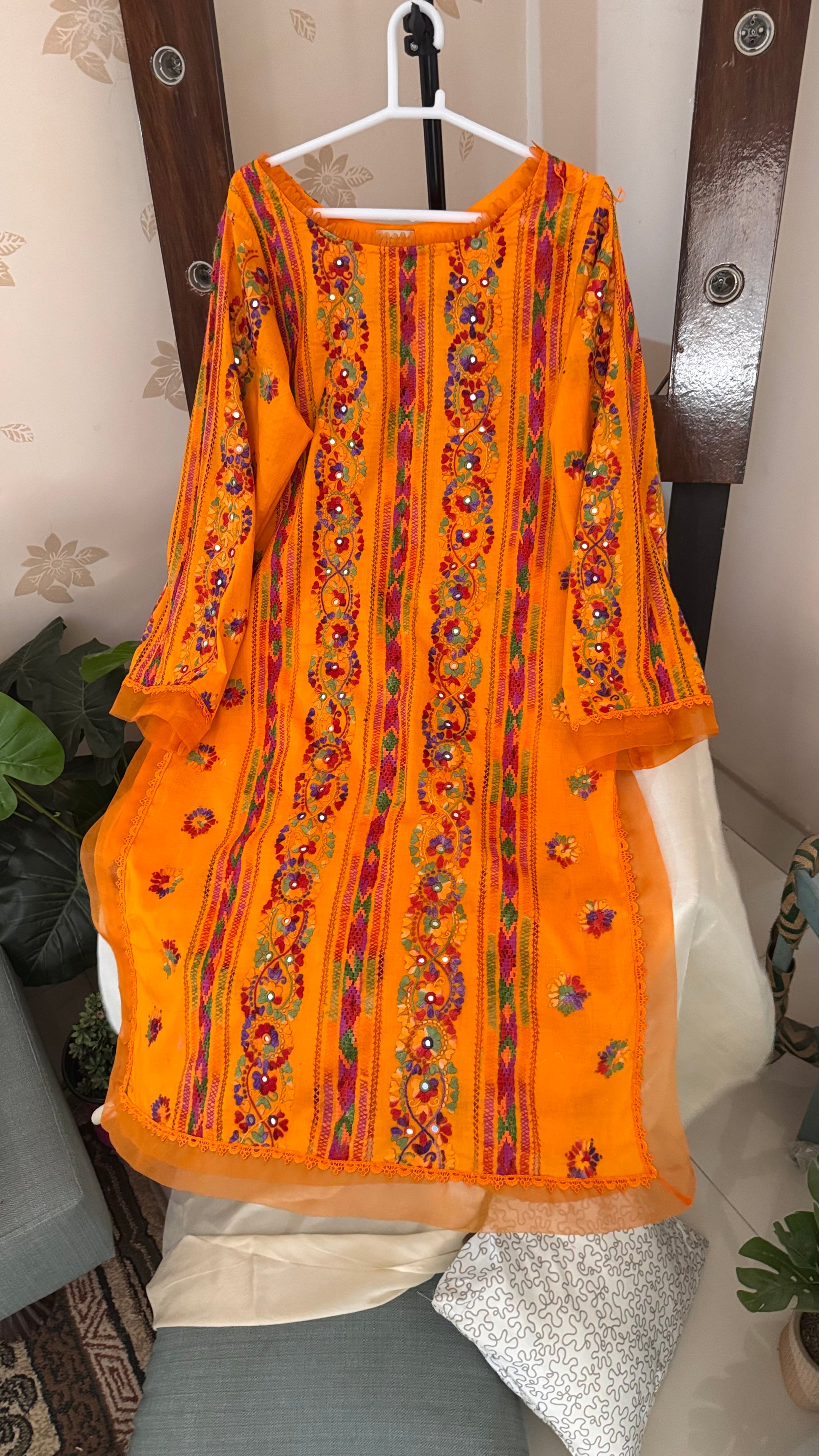 Front back heavily Handmade Tarkashi and Hand embroidered stitched kurta with pure organza and lace finishing.