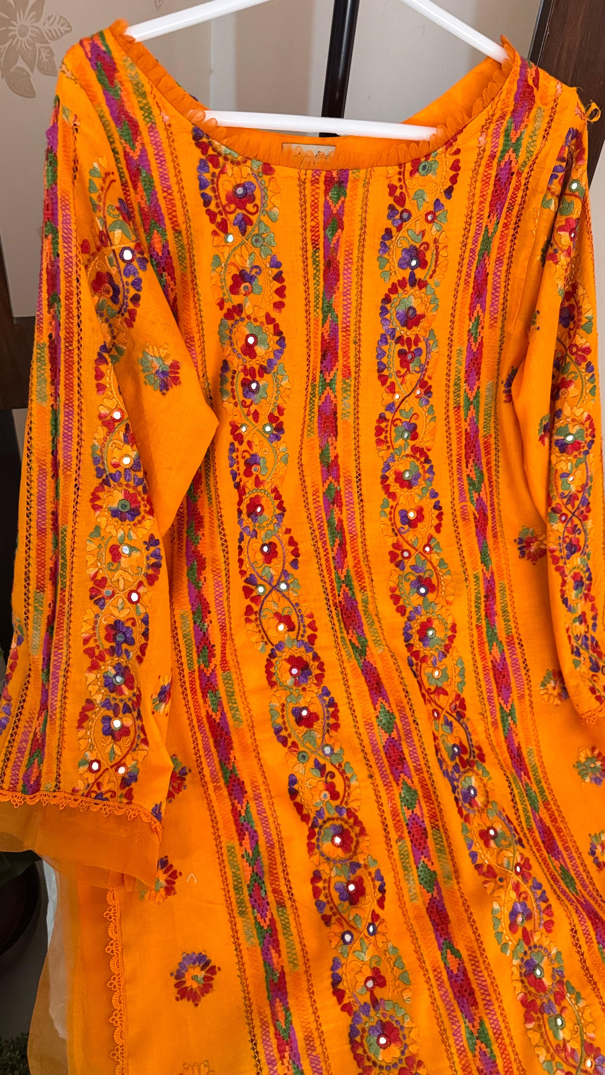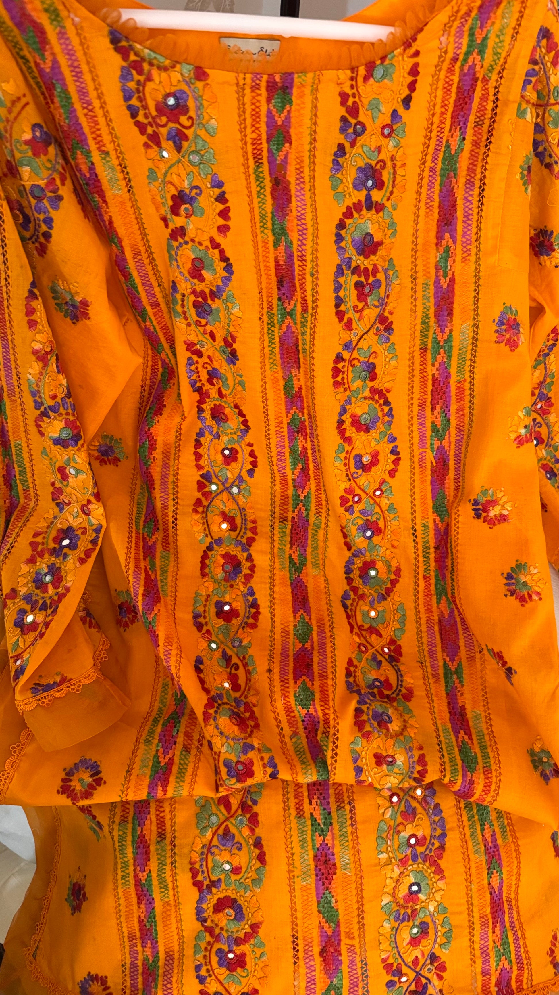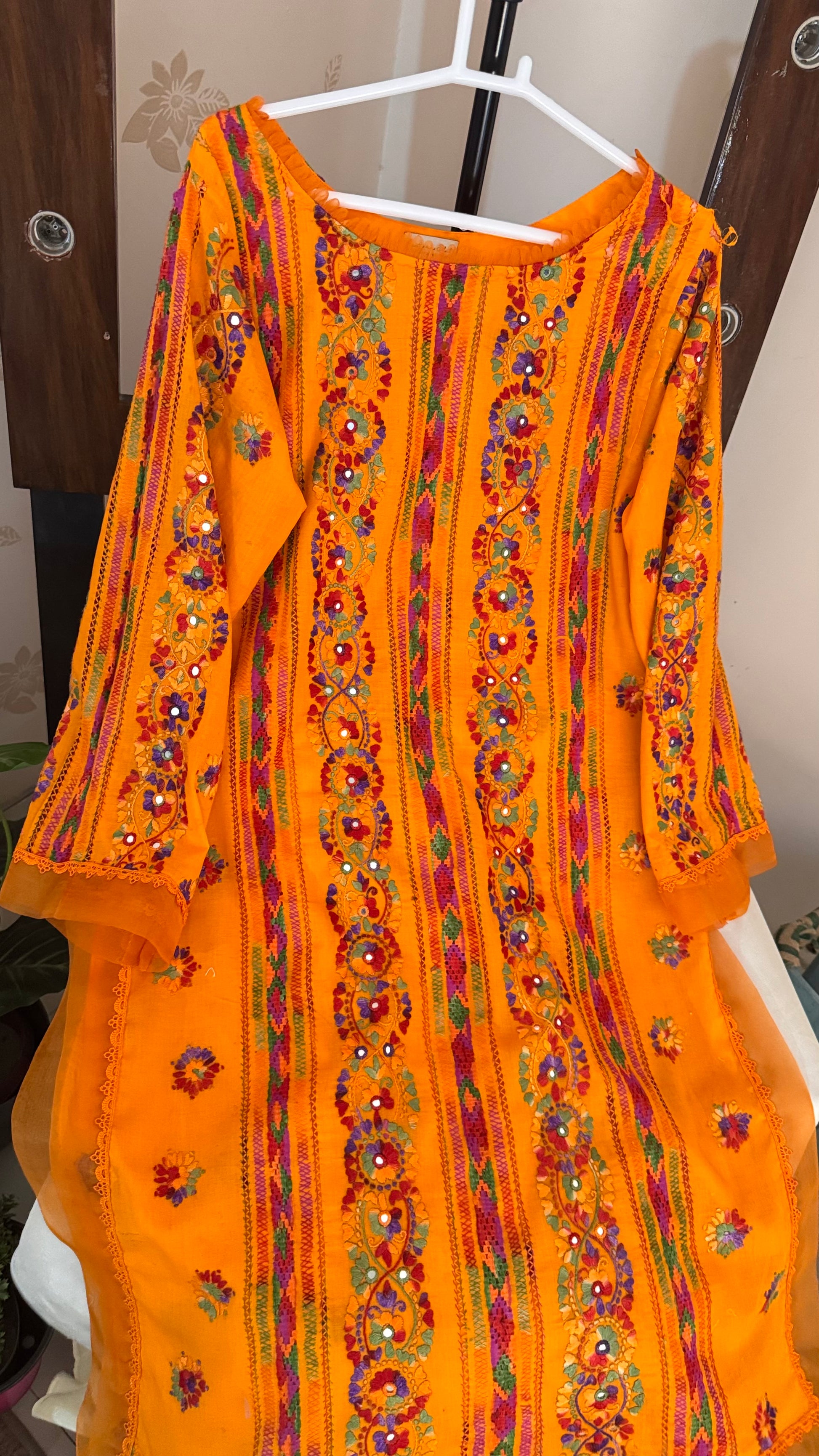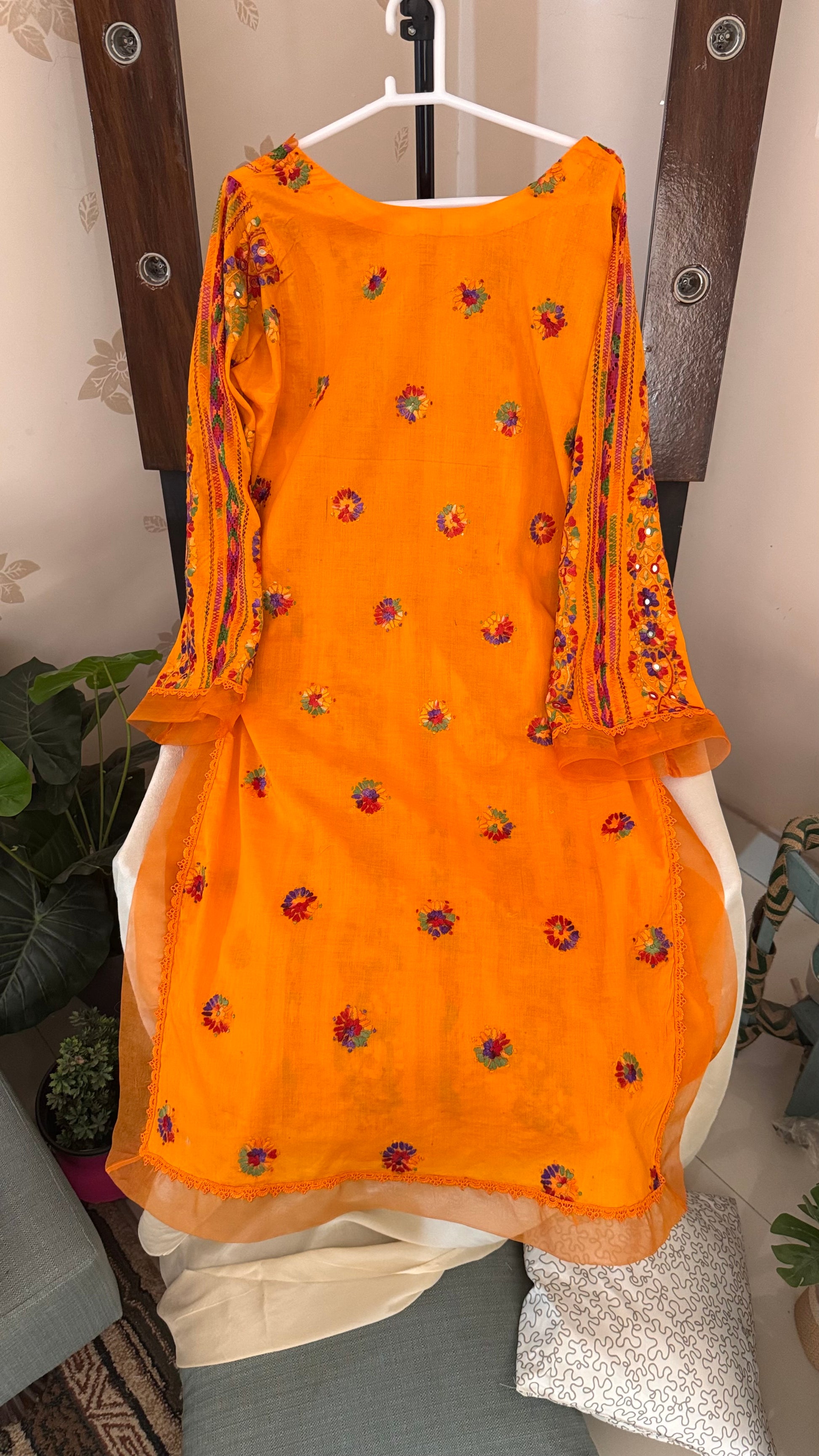 Front back heavily Handmade Tarkashi and Hand embroidered stitched kurta with pure organza and lace finishing.